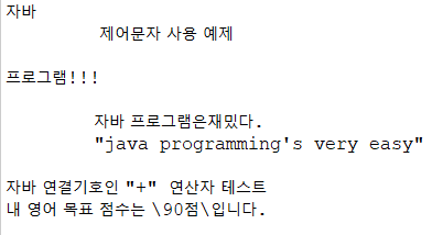 System.out.println("자바\n\t 제어문자 사용 예제\n\n프로그램!!!");